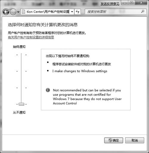 为了保障系统的安全,Windows从Vista开始就喜欢对一些深度操作进行不厌其烦的提示,Windows7也不例外。当你更改计算机设置的时候,半道会弹出一个窗口问你“是真的做相关修改吗?”,很讨厌。不过好在我们可以在控制面板里轻松将其关闭:打开[控制面板]→[系统和安全]→[ActionCenter]→[用户帐户控制设置],把滑块一拖到底,万事大吉(如图12)。
