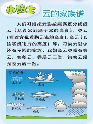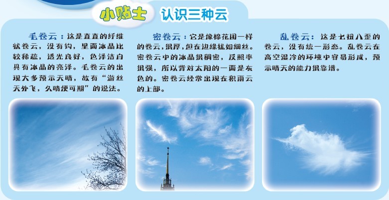 “高空上的钩卷云,淡淡的,任风撕薄扯长。终于消失了,钩挂不着蓝天,地下,也永远没有投影……”这首诗给我们描绘了钩卷云的样子:长长的丝缕,一端如同钩子或者逗号,而且钩卷云出现的时候天空依然湛蓝,地上也不会出现云影。