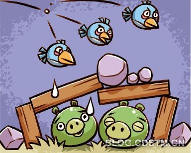愤怒的小鸟家族中,有一种蓝色的小小鸟,它会分身术,在发射到半空时,能分成三只更小的鸟冲向猪堡。想摧毁猪堡,可以一连发射几只这种分身鸟,让它们不要急着撞猪堡,而是分成更小的鸟后,整齐地排列在猪堡上,做脚步一致的运动,比如跳操。如果跳操的步伐完全一致,就能摧毁猪堡。