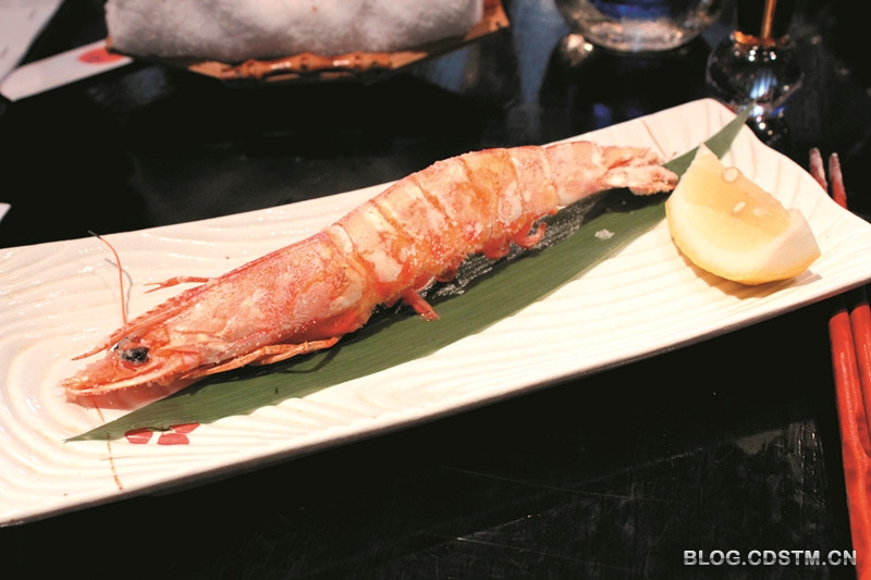 盐虾 日本料理中多以生食和烤制为主,盐菜肴却不多见。当一条十几厘米长的大明虾以盐的形式伸展于您的面前,生猛而惊艳,透着鲜红的光亮,不禁让人垂涎欲滴。将海盐作为导热介质在高温下使原料成熟,既保持原料入锅时的姿态,显得活灵活现,又保留了鲜甜滋味。