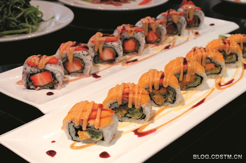 运动寿司 这款菜肴将传统日式寿司与运动、健康的理念相结合,运动寿司的理念便油然而生。“瑠璃紧邻八万人体育场,推出运动寿司最适合不过了。”李波解释说:“说到‘运动’两字,首先人们会想到健康、自然、轻油、少盐、少糖,因而运动寿司,以时令新鲜水果为主,与清淡、生食的日本料理风格相融合,形成一种全新概念的美食,口感香甜清爽,很容易算出所含的卡路里。”精致可人的造型,香甜和谐的口感,令都市年轻女性爱不释手。