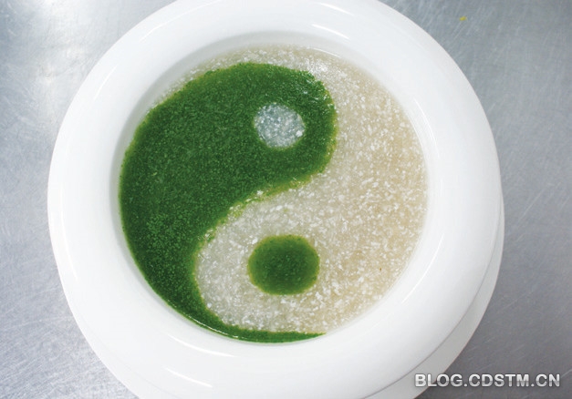 特点:不加味精,用高汤调鲜;以一幅太极图为造型,色泽绿白相间,口感鲜滑爽口。