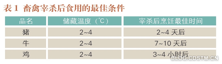 然而,食用家畜家禽类就不一样了。在规范的屠宰条件下,家畜家禽的内脏会很快被清理,细菌对胴体的污染较少。刚宰杀后的畜禽胴体与在0℃ ~5℃ 下放2 小时以后的胴体相比,细菌数增长相差不大。因此,家畜家禽在规范宰杀后最好在低温下放一段时间,这时的畜禽肉经过僵直期进入了成熟期,肉的口感会更好,从食品安全角度看也不成问题。