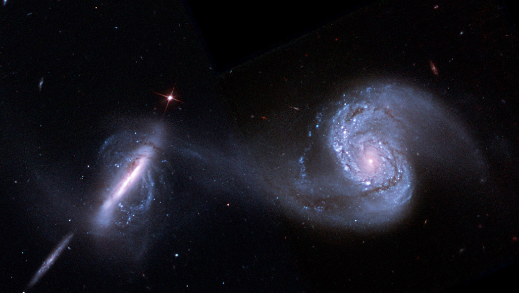 在这对浪漫舞者之间,恒星、尘埃和气体共同构建了一条长约75000光年的丝带。它的存在,说明这两个巨大的星系曾经近距离接触过,并且在强大的引力作用下发生撕扯。Arp 87如今所呈现的,只是星系并合的一个中间过程。在我们的宇宙中,星系并合是普遍存在的,经过数十亿年的时间,它们终将合为一体,成为一个更大的星系。