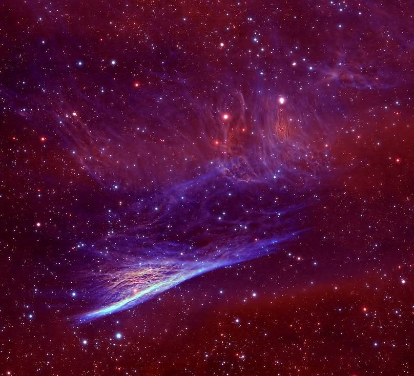 瞧,是谁拂着薄纱在宇宙中轻轻飘过,留下一片曼妙的涟漪?如此别致的景象,其实只是动态影像中的一帧,这片涟漪正以50万千米/小时的速度在宇宙空间拂过。原来,早在11000年前,船帆座天区有一颗超新星爆发,爆发产生的遗迹覆盖了一大片直径约为100光年的天区。船帆座超新星遗迹的一部分,由于外形独特而得名,也就是图中展示的铅笔星云。
