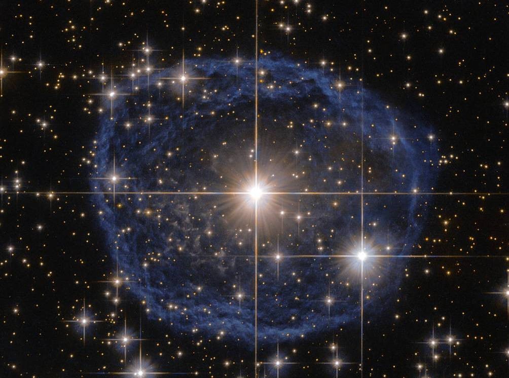 和宇宙漫长的一生相比,有些天体的存在时间就好像只是一眨眼般短暂。比如形成这个蓝色泡泡的天体,沃尔夫-拉叶星WR31a。从地球上看,它位于船底座天区,距离我们大约3万光年远。WR31a的一生只有几十万年,最终它会成为一颗壮丽的超新星,爆发产生的星际物质将会孕育出新的恒星。
