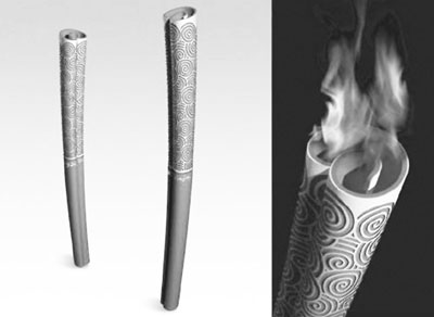 北京奥运火炬“祥云”长72厘米、重985克,它那轻薄铝合金和红色塑胶漆的身形上镌刻着祥云图案,透露出中国“渊源共生,和谐共融”的文化概念,源于汉代的漆红色祥云图案和立体浮雕式的工艺设计凸显火炬的高雅华丽。更让人感到“眼睛一亮”的是,它那酷似纸卷轴的造型,把中国四大发明之一的纸和“纸包不住火”的俗语发挥得淋漓尽致,用“纸卷轴”造型火炬将奥运圣火传遍世界,同时也把“圣火”和“纸卷轴”两者对立统一的奥林匹克精神及和谐理念传遍了世界。