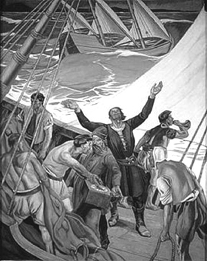他思来想去,决定采用葡萄牙人从前探索非洲航线的老办法:绝对不能冒失驶进海心,要顺着海岸小心翼翼前进,这样既可以避免被汹涌的海流冲卷到无边无垠的大洋里去,又可能遇见别的船只,打听清楚通往目的地的航路。