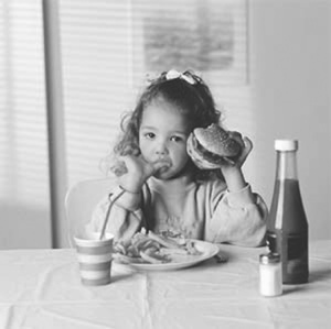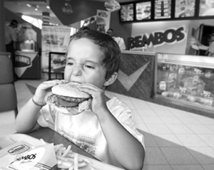 你知道吗?在人体内有一种激素叫“瘦素”,它能控制人体的饮食行为。美国科学家研究证明:汉堡包、炸薯条、炸土豆片等美式快餐会引起体内“瘦素”的变化,使食用者特别是少年儿童难以控制进食量,而过量进食就会让我们成为胖小孩。