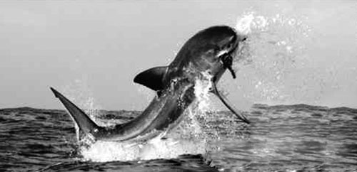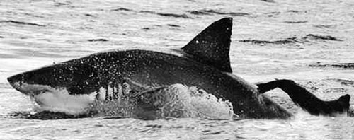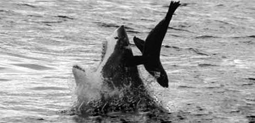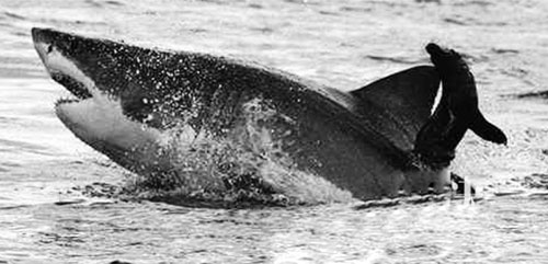 那天和同伴们正在玩捉迷藏,我躲在一个远海的小角落里,没想到,我躲的不是地方,同伴们没找到我,倒是被一只鲨鱼发现了。这只身长近5米、体重超过2000公斤的大白鲨以极快的速度一跃而出,我还没来得及喊救命就被它叼在了嘴里。还好我练过两天功夫:腰一扭身一挺愣是从鲨鱼嘴里挣扎了出来,落在了它的背上。趁它还没明白怎么回事,我赶忙又一个猛子扎到水里,头也不回地拼命往回游,一口气逃回了浅海。
