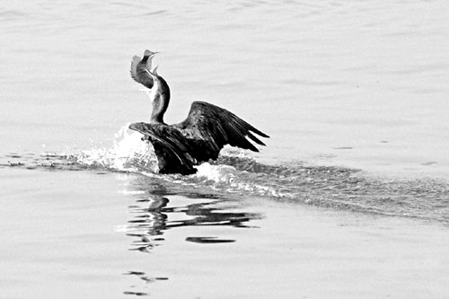 鸬鹚利兹觉得翅膀颇有些酸痛,康尼看出了儿子的辛苦,不得不降到水面休息片刻。单纯的利兹抓住一切机会玩乐。康尼很心疼儿子,这几天,他们都粒米未进。