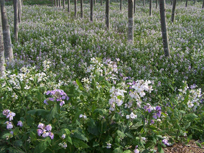 二月兰又叫二月蓝、诸葛菜,在路边常成大片的生长,花朵盛开时好像涌动的花潮。二月兰的身材比地黄还要高些,站在花丛中,可以没到膝盖。它的花淡蓝紫色,有时变成白色,几朵到十几朵开在茎的上部,下面的花先开。每一朵花都只有4个成“十”字形向外伸展的花瓣,花的中心可以看到6个雄蕊,上面的花药鲜黄色,长长的略弯曲。二月兰开花时间很长,往往边开花,边结果。它的果实又细又长,有些像羚羊的长角。
