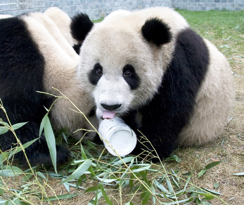 图注:国宝大熊猫也不能饭来张口呀。把好吃的放到管子里,大熊猫,自己想办法把吃的弄出来吧。(大熊猫:这样吃饭真有意思。)