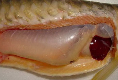 收拾鱼的时候,剖开鱼肚子,就能看见里面有一大一小,连在一起的两个白泡泡。用手捏一捏,里面都是气。这两个泡泡就是鱼鳔,它大约占了鱼身体的5%左右。