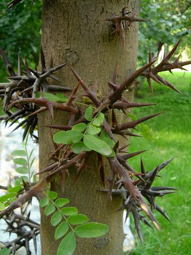 皂荚的树干和枝条上长了许多大而带有分支的枝刺,看到它会让人想到古代兵器“狼牙棒”。它那狰狞的形态让人不寒而栗,别说是攀爬了,见过它的人都会避而远之。枝刺是枝的变态,从茎的内部产生,和茎的维管束相连,一般不容易折断或剥离。典型的枝刺植物还有刺榆、枸橘等。在潮湿环境下枝刺还能生叶或开花呢。