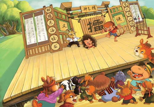 小猴子没辙了,小刺猬可要开始反击了。它把刺球一样的身体滚向小猴,逼得小猴连连后退,一不留神,小猴子跌下了比武台。