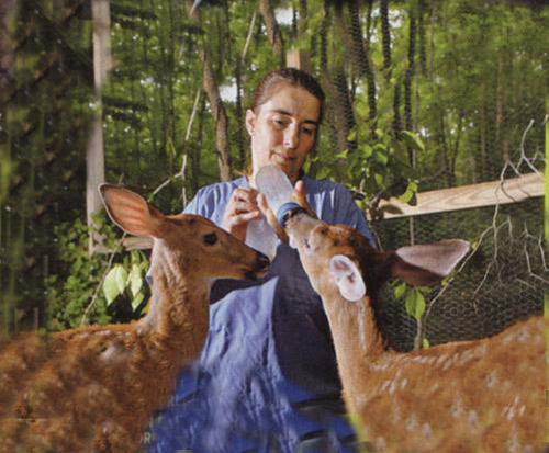 人们把小鹿送到野生动物救助中心。工作人员立刻给它保暖,并喂了它一瓶奶。然后,工作人员把它放进一个笼子里,让它同其他几只小鹿在一起生活。