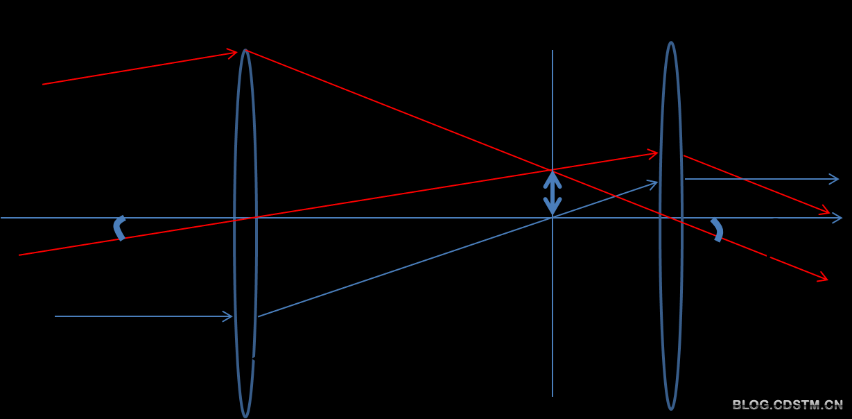 用望远镜观看遥远的星体时,我们看到的都是近似平行光。因为即使是最近的星体(比如月球)上的某一点发出的光,也是经过了几十万千米才到达地球。考虑到这一点,图1中选取了两束有代表性的平行光,假设他们是来自月球上下边缘的两点。这两束光经过凸透镜以后,汇聚到凸透镜的焦平面上,成为两点(见图1中虚线)。但是在它们汇聚成两点以前,我们用一块凹透镜把它们重新散开成平行光,就像直接用眼看到的那样,唯一的不同是,这两束光之间的夹角变大了。这样,透过望远镜,我们看到的月亮上下边缘的两点之间的夹角就比不用望远镜时要大,从而月亮就被放大了。放大倍数怎么计算呢?望远镜的放大倍数定义为对夹角的放大。它的计算可以借助图2的光路图。