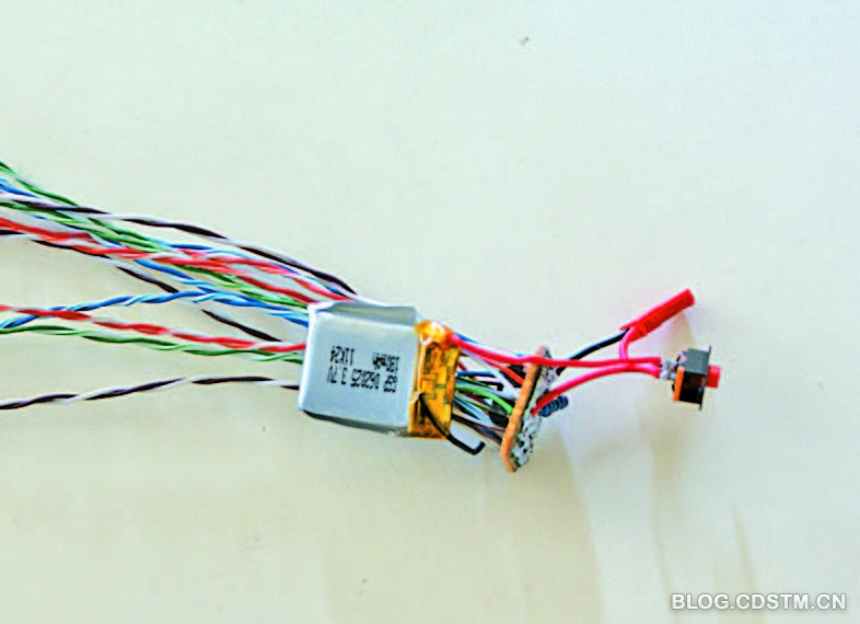 估计你会很好奇地问,一共才6个可用I/O引脚的 ATtiny13,怎么能驱动12个LED呢?其实,我要告诉你,它不仅可以点亮每个LED灯,而且还能控制每个LED的亮度呢!这才是本次制作的精华。在制作的过程中,发生了一点小小的意外。由于我购买的JST充电线和原来的充电器引脚相反,致使我原本打算使用的小型锂电池损坏,不能充电。在万般无奈的情况下,我只好更换体积更大的锂电池了。