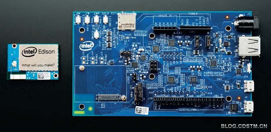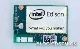 在2014 年11 期《无线电》杂志关于第二代Galileo 的文章中,我提到英特尔针对物联网、可穿戴、创客领域还有另一款产品——Edison,这次我们就来介绍一下这个能力超强的“小”家伙。称它为“小”家伙是因为它的体积只比SD 卡稍大一些——35.5mm×25.0mm,如图1 所示,但它的硬件却是一个基于Intel芯片的PC 配置:双核500MHz 32bit ntel
