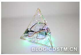 台灯的基本框架做好了,我们把连接好的电路放进去。用热熔胶将电路板粘贴在框架结构内侧,把七彩灯带轻轻缠绕在搭建好的结构上。