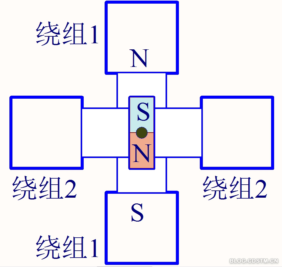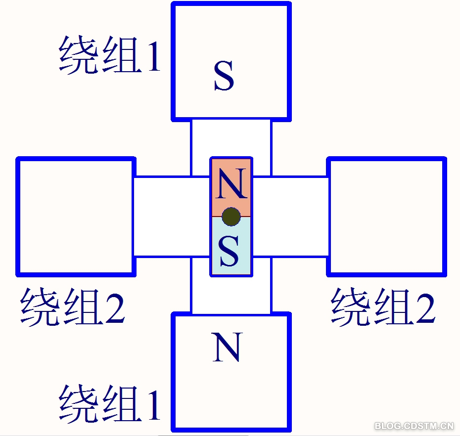 3种种类的步进电机虽然结构上有很大区别,但其基本的工作原理差不多。下面以步距角为90°的步进电机简单模型来讲解工作原理。图4就是90°步距角的步进电机结构模型,中心的转子是由永磁体组成,转子至少由一块永磁体组成,通常都不止一块,而围绕转子的是定子,是由绕组群组成。这个结构和普通有电刷的直流电机不一样,直流电机转子是绕组,定子则是永磁体,当直流电机给绕组(转子)通电时,通过转向器作用,转子会使电机轴不停转动,而步进电机给一组绕组通电时,这一绕组产生磁场,转子受磁场作用会转到这个绕组的位置上,并保持在这个位置上。