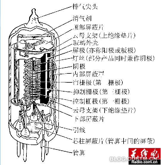 电子管的种类很多,用途也各不相同。但由于它们几乎都是利用电场对真空中的自由电子传输进行有效控制的器件,所以尽管在结构上各有特点,但其基本部件却有许多相同之处,大体上都是由基座、加热灯丝、电极和管壳所组成。其中,电极是电子管的关键结构件,通常有阴极、屏极和栅极等三种电极,它们都是由各种不同的金属或合金(如镍、钼、钨、铬、铜、铁及其合金)所制成。