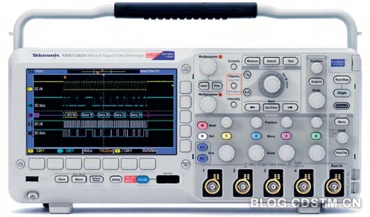 TLS216的平淡反响使得厂商们不得不重新审视使用者对多通道产品的应用需求,很快地,他们就发现,虽然使用者希望同时观察更多路的信号,但这些信号往往并不都是模拟信号,而是几路数字信号和2~3路模拟信号的混合体,只要为普通示波器增加一些数字通道就能满足大部分测量要求。而且这样做并不需要添置多路繁复的模拟放大电路,更无需增加多个高速A/D转换器和大量数据处理器件,自然也不需要增加太多成本。在这个思想的指导下,新一代的带数字通道的示波器MSO——混合信号示波器诞生了。
