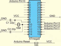 连接硬件,准备烧入引导加载程序ATmega8 的引脚1 连接ArduinoPin10; 引脚7 连接VCC; 引脚9、10 之间串联16MHz