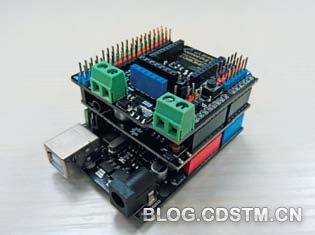 首先把中文语音识别模块插接在Arduino UNO 控制板上,然后再将I/O 扩展板插接在中文语音识别模块上,完成后如图3 所示。