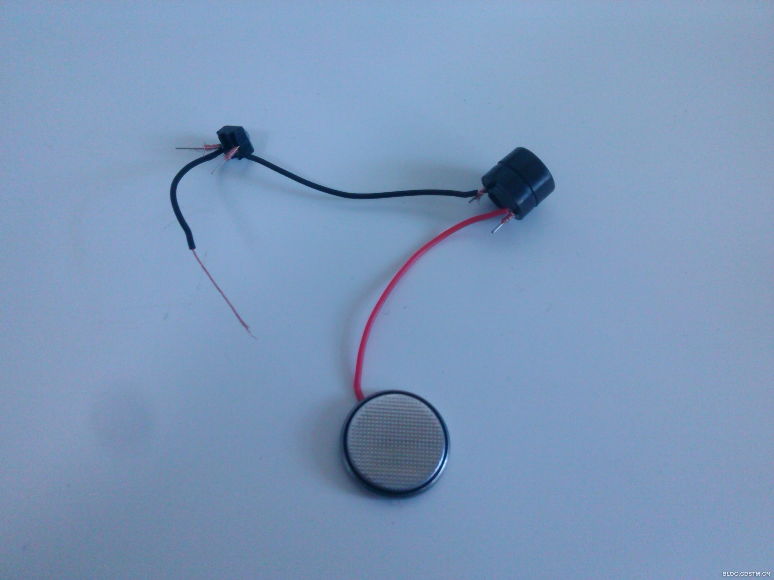首先用绕线器将蜂鸣器和两只长腿开关连接起来,我们可以看到当开关闭合时,蜂鸣器发出声响,这里的蜂鸣器是一个5V有源蜂鸣器,它在纽扣电池的3V电压下就可以工作,而且它自带频率发声装置,因此通电后就可以工作,而不需要单独地给它输入音频信号。