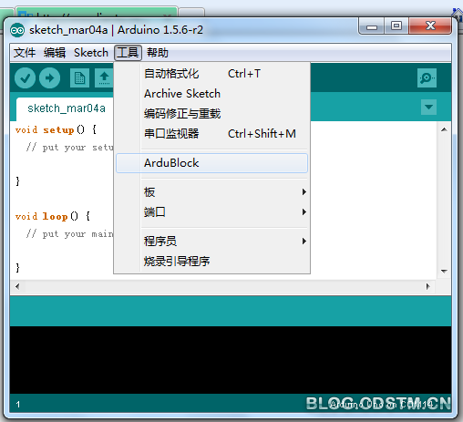 使用ArduBlock软件可以很方便地在不编写代码的情况下使用类似S4A拖拽式的操作,完成对Arduino的编程,在这里我们使用的是ArduBlock的教育版本,在网盘http://pan.baidu.com/s/1mgmRHBa,下载EDUarduino后,解压缩即可使用。安装驱动,在Arduino软件中选择好串口号后,选择工具菜单中的ArduBlock选项就可以使用。