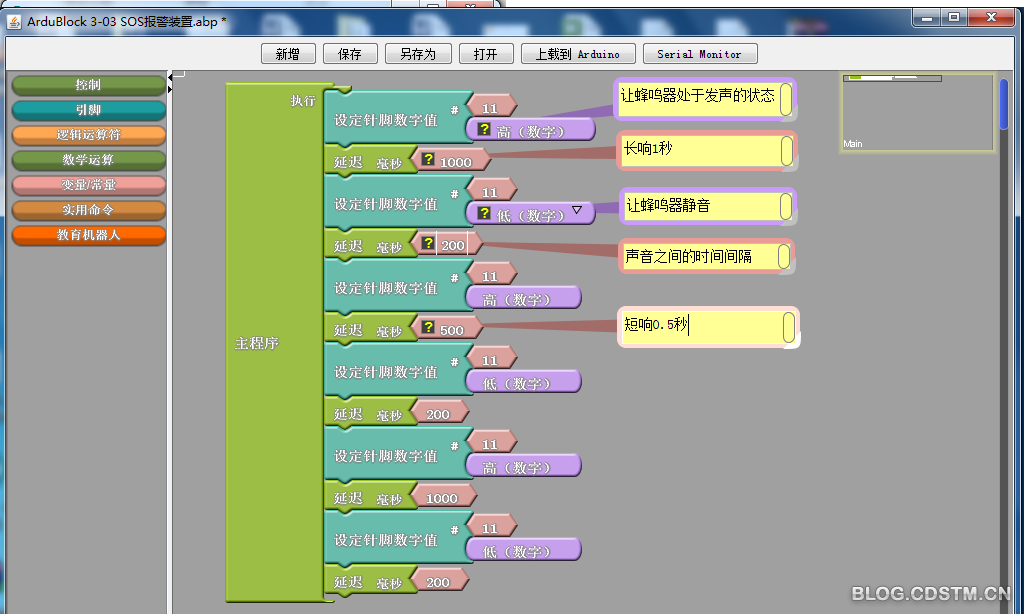 使用S4A的好处是比较直观,并且能够制作一些互动多媒体效果,但是缺点是Arduino必须连接电脑才能使用,事实上程序是在电脑上运行的,arduino只是一个根据通讯协议完成指令的“傀儡”,为了让Arduino能够独立完成播放SOS报警音的工作,还需要使用ArduBlock软件将程序下载到Arduino当中。