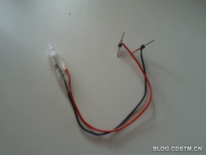 我们在产品阶段,需要构建一个情境,让LED的闪烁变得有意义。我们可以用排针将蓝色发光二极管引出来,在延长LED的过程中,可以将发光二极管的两端用透明胶带粘起来,避免短路。