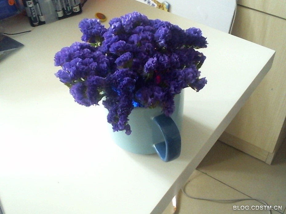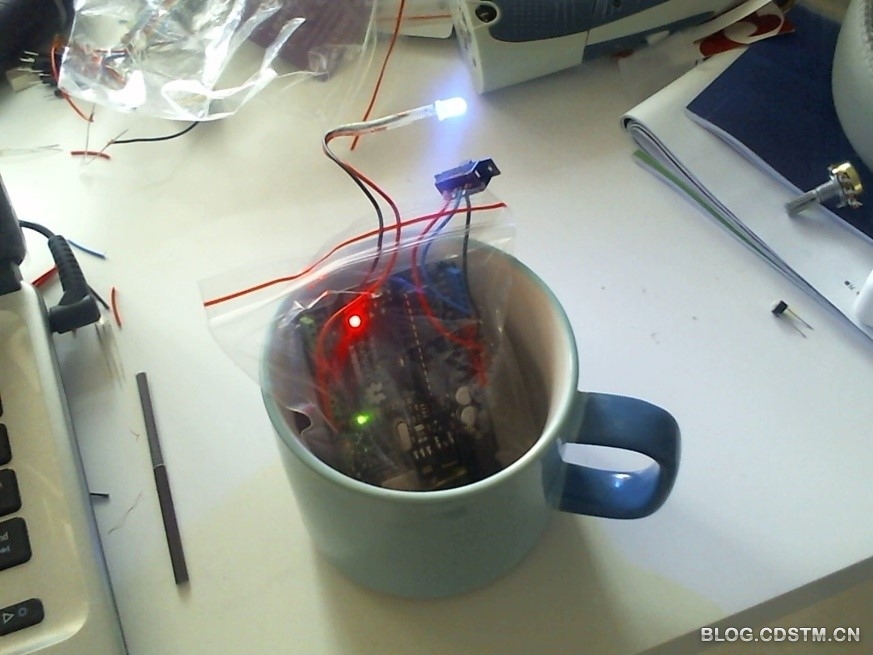 接下来用一个塑料袋将Arduino和9V电池装起来,放在一个马克杯当中,将LED和开关露出来。然后为了配合蓝色发光二极管的颜色,可以在马克杯上铺满一排蓝色的勿忘我花丛,这样将发光二极管和Ardunio挡住,这样就完成了一个闪烁着的蓝色光芒的勿忘我花丛。