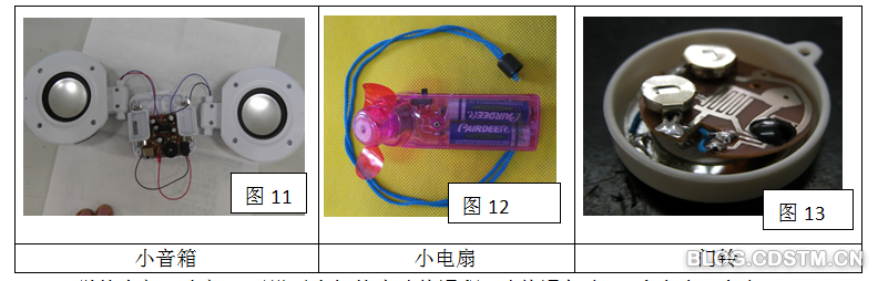学校在初一和初二开设了多门校本选修课程,选修课每班10人左右。小班化教学便于教师指导学生开展实际活动,动手操作。学校在初一开设了趣味电子技术课,通过学习这门课程,学生可以认识常用的电子元器件、电路符号,了解元器件的基本特性,练习简单的焊接技术。授课教师采用一个个小作品来调动学生的积极性,学生在完成任务的过程中,学习到了电子技术的基本知识,锻炼了动手实践操作能力,体验了实践的快乐。学生大多数选择与生活实际相结合的小作品。图11、图12、图13就是其中的3件作品:小音箱、小电扇和门铃。学生制作的小小验钞机、小台灯、小手电都能对同学们的实际生活有所帮助。