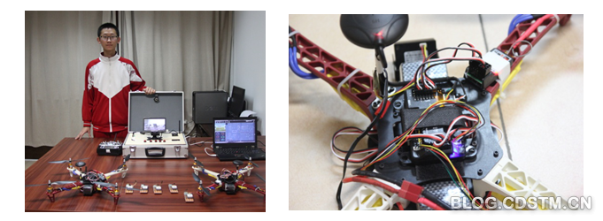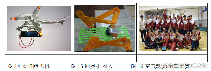 通过初一的学习,学生们对电子技术有了浓厚的兴趣,也打下了一定的基础,认识了基本的元器件,学习了简单的焊接技术,为后面做了铺垫。在初二年级学校开设了科技校本课程,全体学生都要参与。老师为学生选择了一些跟电子技术相结合的项目,空气动力小车、水陆两栖赛船和太阳能飞机等,在这些项目中,学生们要接触到马达、太阳能板,学生们要看着图纸组装调试设备, 图14所示是学生组装好的太阳能飞机,图15所示是学生组装好的四足机器人,图16所示是组织同学到体育馆去比赛做好的空气动力小车。