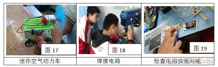 同学们对科技校本课程非常有兴趣,由于每个班的人数都在30多人,活动受到一定的约束。因此,在学校的支持下,利用课余时间,又开设了很多选修课,以利于针对学生的爱好进行选择,个性化培养。灵巧手DIY小组由20名同学组成,是喜欢电子制作的同学自愿报名而成。图17所示是同学在调试空气动力小车,图18所示是同学在焊接电路,图19所示是同学在检查电路安装问题。这个小组中大量作品都是以电子技术为基础,进行创意。同学们应用电子技术课上学到的知识和技能,对作品进行创意。报名这个小组人数非常多,由于场地约束还不能完全满足更多的同学来参加。