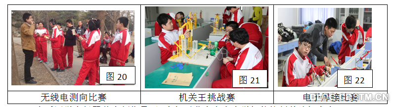 学生积极参加市区举办的比赛,通过比赛带动学生学习电子技术的热情。图20所示是老师们组织学生在公园参加无线电测线训练;图21所示是老师指导学生参加机关王挑战赛,准备作品。机关王比赛,需要学生灵活运用声光电磁等大量物理知识来设计作品,非常有挑战性。图22所示是同学们在准备电子技术焊接比赛。