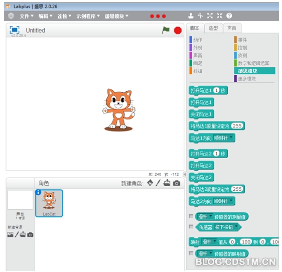 Labplus软件: 我们使用的是Labplus版的Scratch,它是根据盛思乐动魔盒特别改进的一个版本,在官方版的基础上主要添加了识别外部连接的传感器的模块,能够很便捷地获取外界信息。