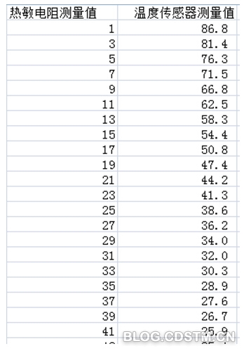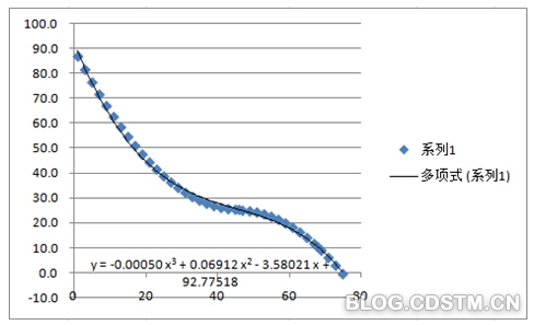 插入散点图,添加趋势线,根据曲线规律,用3次多项式拟合,选择显示公式,这样就得到了热敏电阻的值与实时温度的关系,即y=-0.0005x3+0.06912x2-3.58021x+92.77518(y表示真实温度,x表示热敏电阻的值)。
