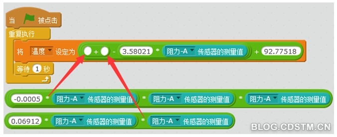 对应程序编译先添加一个变量“温度”,然后用Scratch语言来表达这个公式。如图8所示