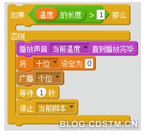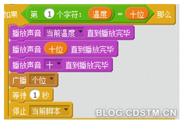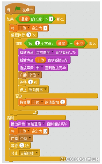 我们在代码的末尾加上“等待1秒”,是为了让语音听起来没有急迫感。“停止当前脚本”是为了防止两段语音同时播放的状况发生。关于播放十位上的语音的完整代码如图12所示。