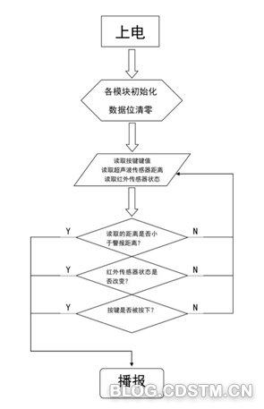 软件设计的总思路为:开机上电,各模块初始化,反复读取并处理按键、超声波传感器、两个红外传感器的状态,若按键被按下,则播报当前障碍物情况以及地面情况;若超声波传感器测的距离小于设定的报警距离,则播报当前障碍物情况以及地面情况;若任意一个红外传感器状态改变,则仅播报当前地面情况。上文提到过本作品针对的是残障人士,成本也要作为考虑的主要因素,想要把成本控制到最低,那么功能的实现要尽量基于软件而不是增加外部模块,所以报警的功能要由单片机直接驱动发声器件实现。所以在软件方面,巧妙运用单片机的PWM脉宽调制端口,在不使用语音模块的情况下,报警提示音能够避开通常采用但盲人不易理解的“嘀”声报警,而是采用真人中文发音录制,用音频处理软件把音频转化成8位8kHz采样的音频编码,存入单片机的ROM中,并用PWM脉宽调制解码并直接播放。系统流程图如图1所示。