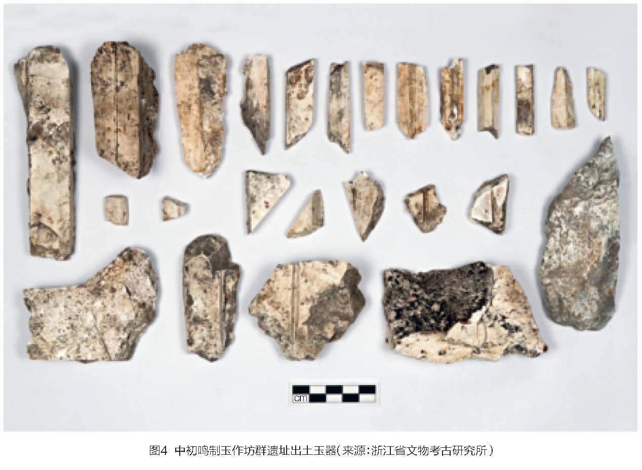 另外,近年来德清雷甸中初鸣一带的调查、勘探、试掘及发掘显示,距离良渚古城约18 km处的德清雷甸一带分布着23处与玉器制作加工有关的遗址点,分布总面积达100万m2,年代距今4 500— 4 800年,已命名为中初鸣制玉作坊群(图4)。其中木鱼桥、小桥头、保安桥、桥南、王家里等经过发掘,均出土数量不等的,带有加工痕迹的玉料、玉锥形器、磨石、燧石等。这一玉器加工作坊群产品种类集中,以玉锥形器等小件玉器为主,玉器及原料数量丰富,说明这里有着相当大的生产规模。从保安桥、王家里清理的7座墓葬资料可知,随葬品的组合和风格与良渚古城遗址的墓葬接近②。在德清雷甸及余杭塘栖除了中初鸣作坊群外,还分布有下高桥、西坝头、南塘角、高地廊、六墓里等遗址,构成一处小型遗址群,可作为良渚古城腹地的北端。
