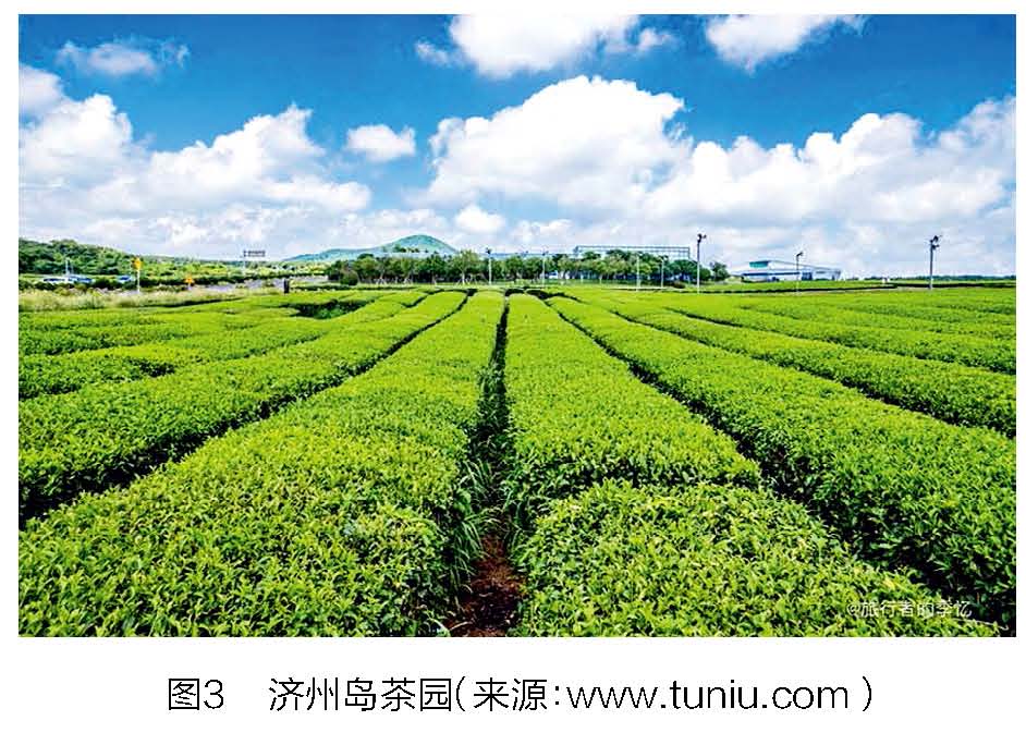 济州岛茶叶生产发端于一家私营公司—欧雪绿(O’sulloc),它在济州岛建厂,并由此开始生产茶叶。济州岛地区拥有韩国唯一一处有机质含量非常丰富 的黑色火山灰土壤地,适于茶树生长和优质茶叶的生产(图3)。此外,由于济州岛的亚热带气候,茶树的生长周期更短,比其他地区早一到两周,这使得能在 每年4月5日前采摘的明田茶(Myeongjeon cha)成为济州岛独一无二的茶叶。济州岛绿茶采用火山岩 水浇灌,无污染,富含矿物质和营养成分,饮用安全。