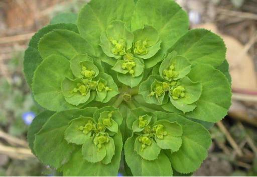 问度娘,才知道奶浆草的中药名叫泽膝。泽膝,它的别称太多,名儿也很形象。泽膝的茎、叶、花折断都能流出白白有黏性的浆汁,我家乡叫它奶浆草。当泽膝开花之前,顶部分成五枝,枝短,成平面展开,枝条下方叶片密集,叶片内窄外宽,钝圆形,像扇贝。互生的叶片层层叠叠,填补了相邻叶片之间的空缺,组成五朵云的图案。随后,五个枝条顶部抽出短的花茎,每个花茎成等边三角形平展开形成花序,每个花序下面有与顶部叶片同样钝圆形的苞片衬托,每支花茎顶部现出几个斜向上的花蕾,成圆形分布点缀在叶片中间,围绕主茎成同心圆。花蕾绿中带黄,镶嵌在圆叶片中,真像圆圆的猫脸上滴溜溜盯人的眼睛,整个顶部又像大大的狮子头。当开花时,等边三角形的三支花茎成斜上伸,形成伞状花序,开出亮黄色的花朵。
