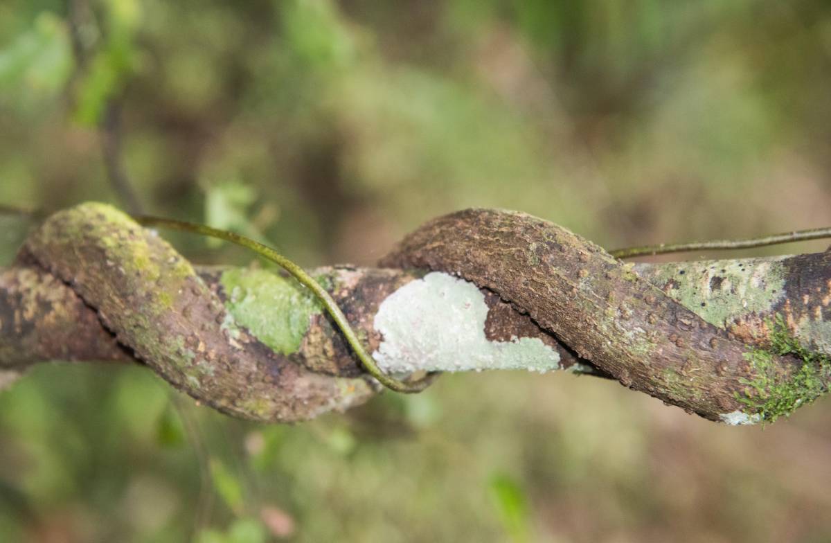 在野外,络石大多生长在阴山峻壁悬崖,或包络在岩石间、以石为家,或蔓延于树木上、缠绕盘转,茎节着处即生出气根,稍有雨露滋润,气根便能粘附于砖石壁上,茎枝四通八达。络石叶厚革质、凌冬不凋,花儿白果儿黑,赤褐色的茎枝折断处会有白色汁液流出。于是它有了很多别称:“石龙藤”“耐冬”“石鲮”“悬石”“石血”“红叶对肾”……