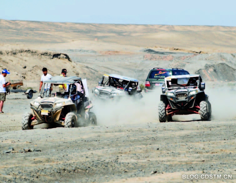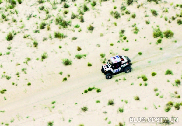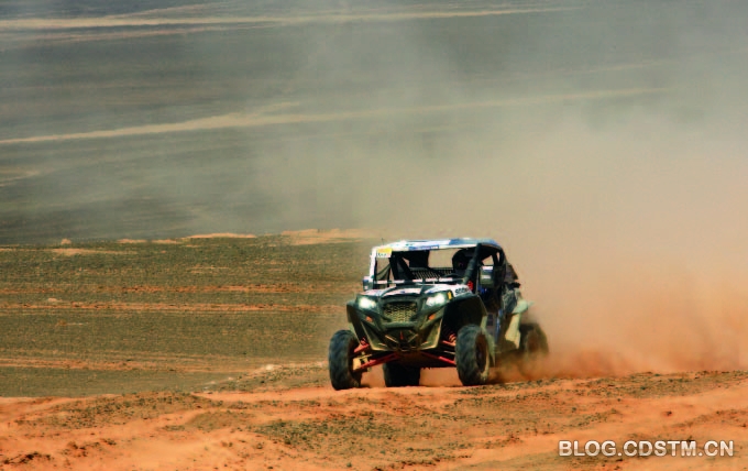 我们在比赛时是顺风跑,风从后面往前兜过来,对车辆散热降温十分不利,但我一直没有受到高温散热的困扰。第三,这种车重量轻,包括在一些难度很大的赛段如库尔勒的好汉锅、英吾斯唐赛段翻越沙山的过程都很顺利,车辆很结实。每天完赛,只是给车辆做专业的电脑检查和保养,没有修理过,这为我节省了大量时间和体力,不像以前还要自己联系修理工、找配件、等配件,操心又费力。最后,这次参赛,北极星的后勤团队很强大,三台赛车,有2 0多人做后勤。我们一日三餐都在营地解决,有菜有饭,非常丰盛,有一次大家还在营地包了包子吃。我们没有住酒店,帐篷就很舒适,淋浴系统完备,睡的是床。另外,北极星还为赛车准备好了各种配件,