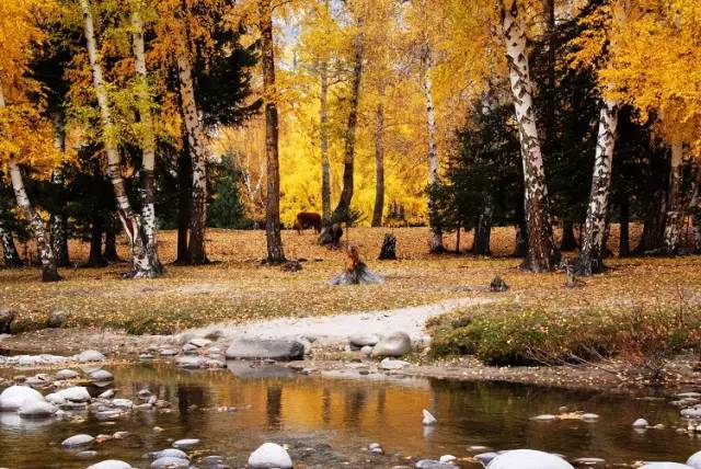 河谷中郁郁葱葱的原始森林,有银白杨、额河杨、欧洲黑杨、银灰杨、白桦树以及各种灌木丛等,共同描绘着美丽的画卷。